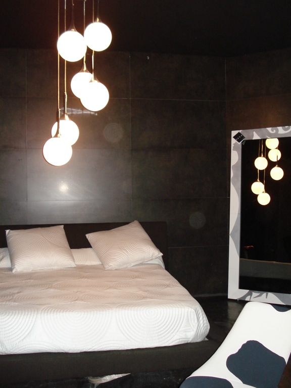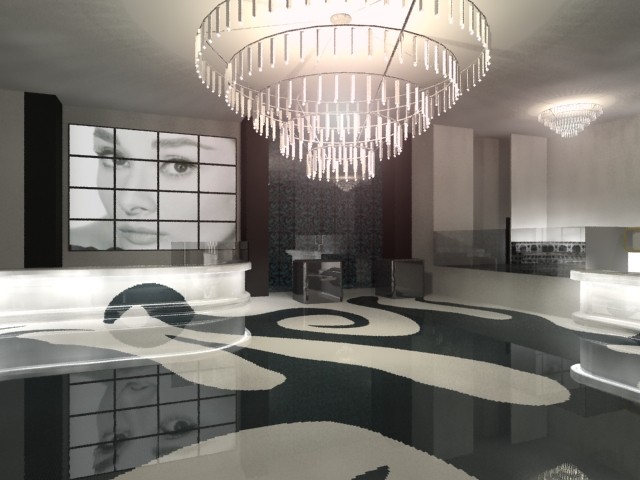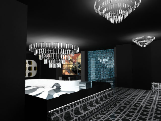 Todos estos revestimientos se hicieron con gresite de la casa Bisazza y en la zona VIP se alternó el gresite cerámico con el de oro. Otra propuesta que le hicimos fue la de la lámpara de araña de la pista de baile que estaba motorizada para que subiera y bajara cuando se necesitara.