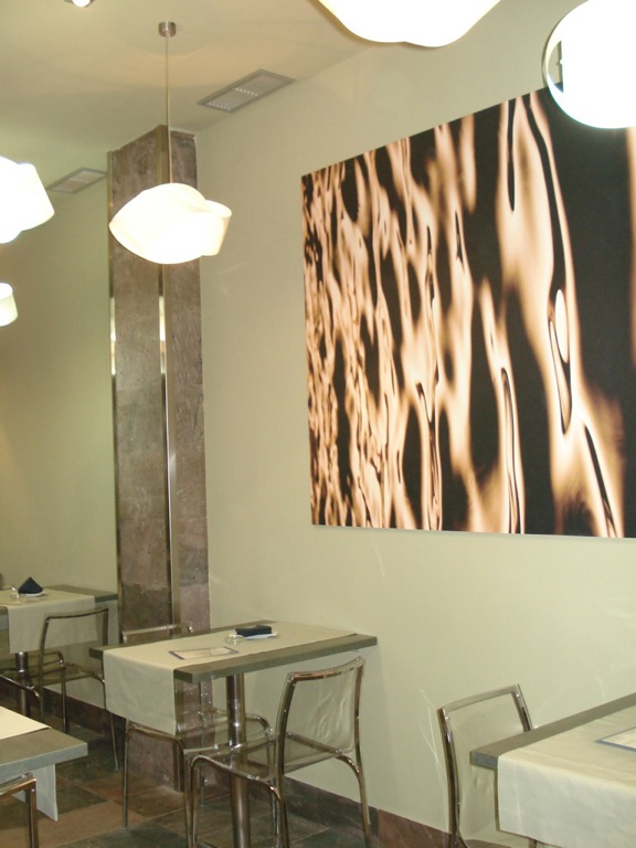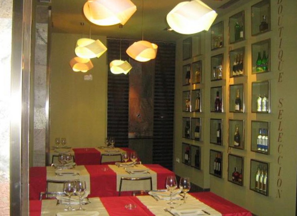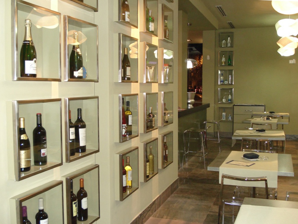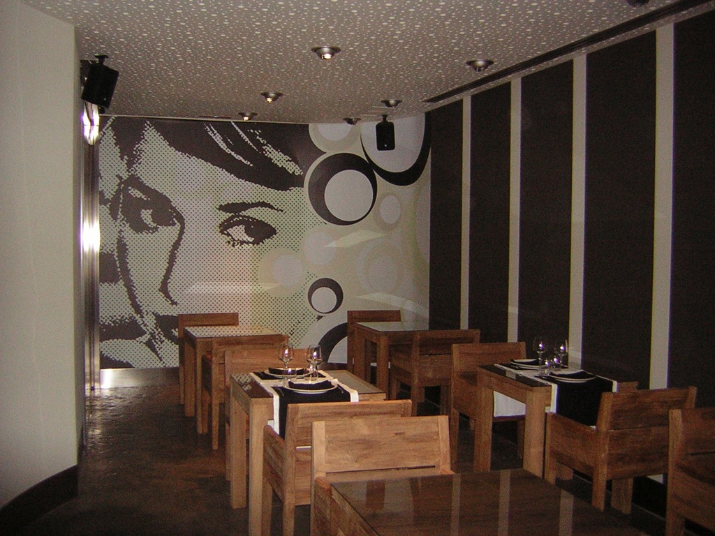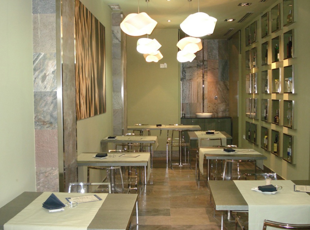 El mobiliario y expositores de producto del restaurante fueron diseñados exclusivamente para él. Y a nivel de materiales el que predomino fue la pizarra traÃda expresamente desde Asia, de una belleza y peculiaridad sin igual.