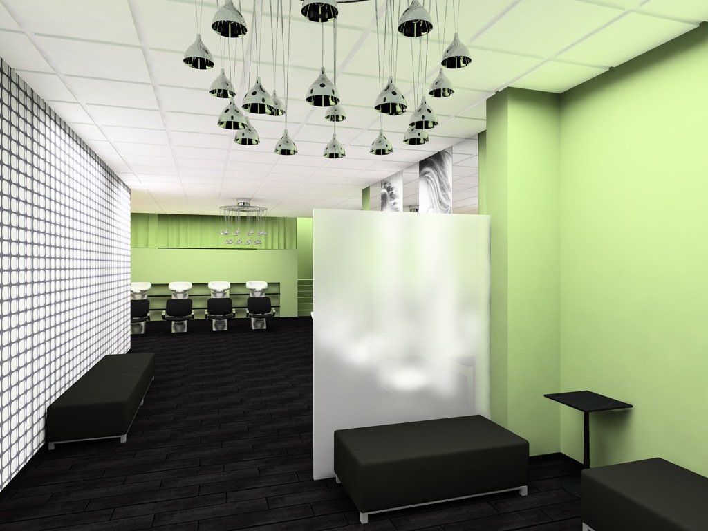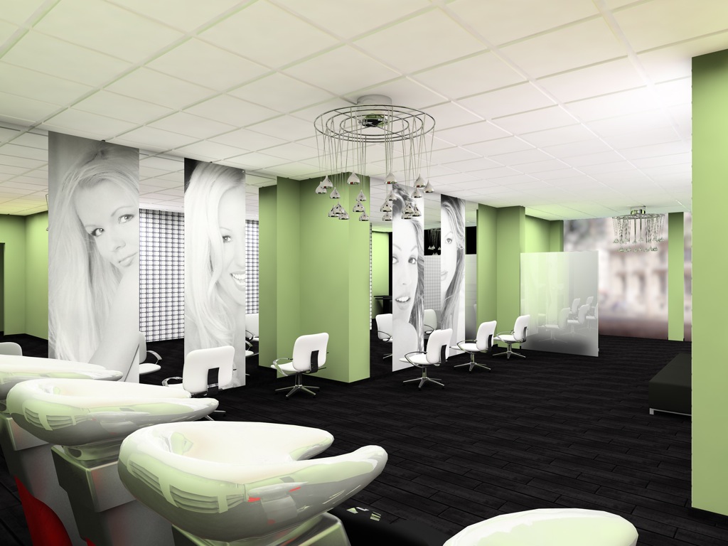En la zona de secado añadimos imágenes tamaño real de chicas, entre los epejos y rematamos con un color vivo como es el verde en las zonas donde no habÃa papel rematándolo con un suelo en madera oscura.