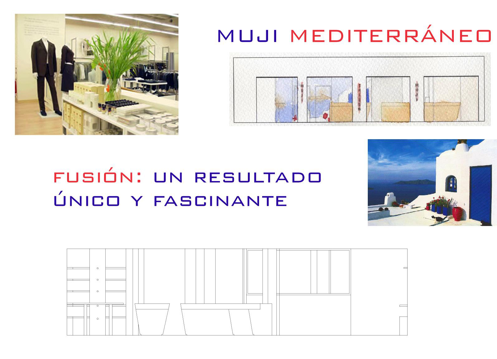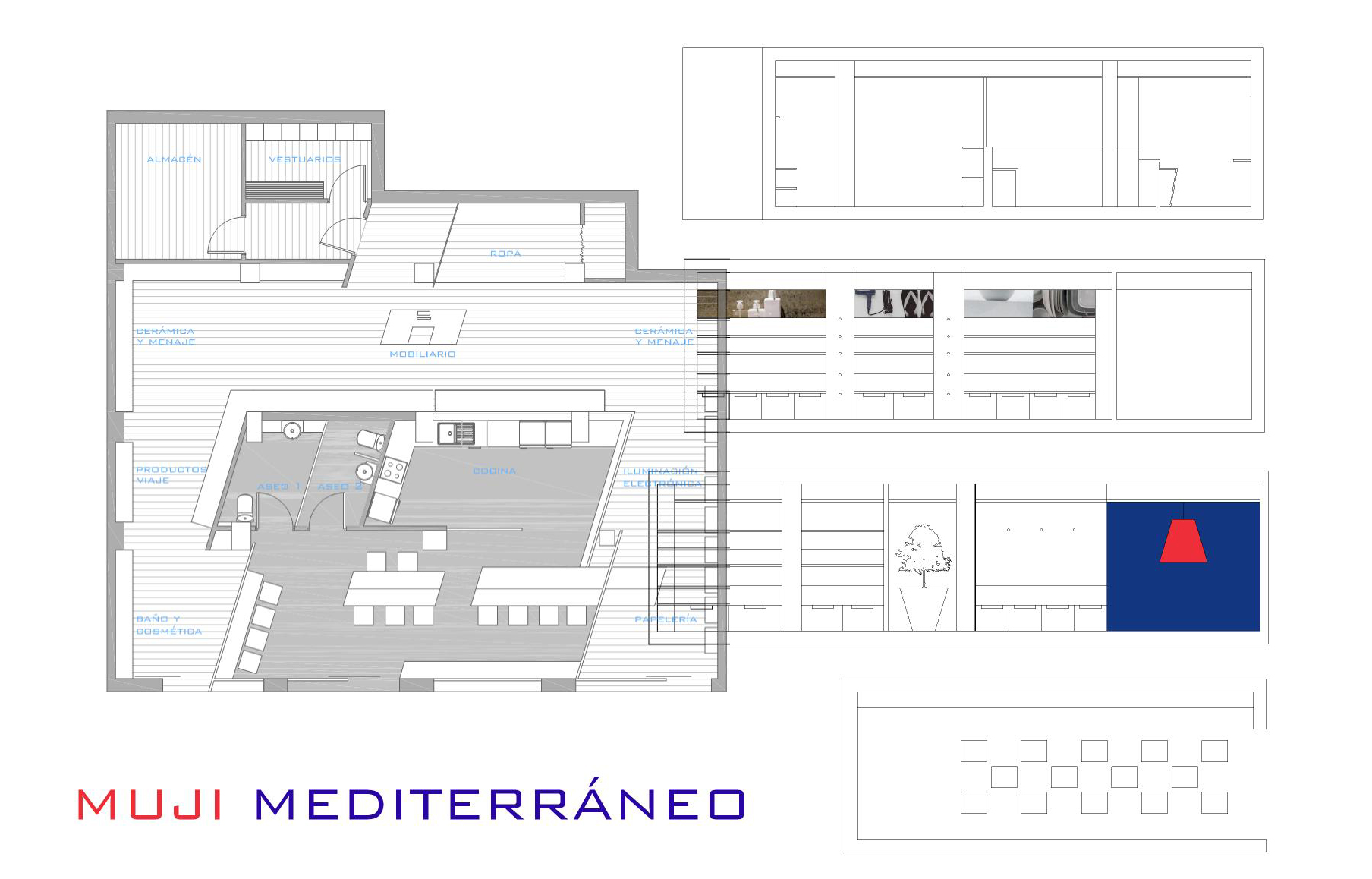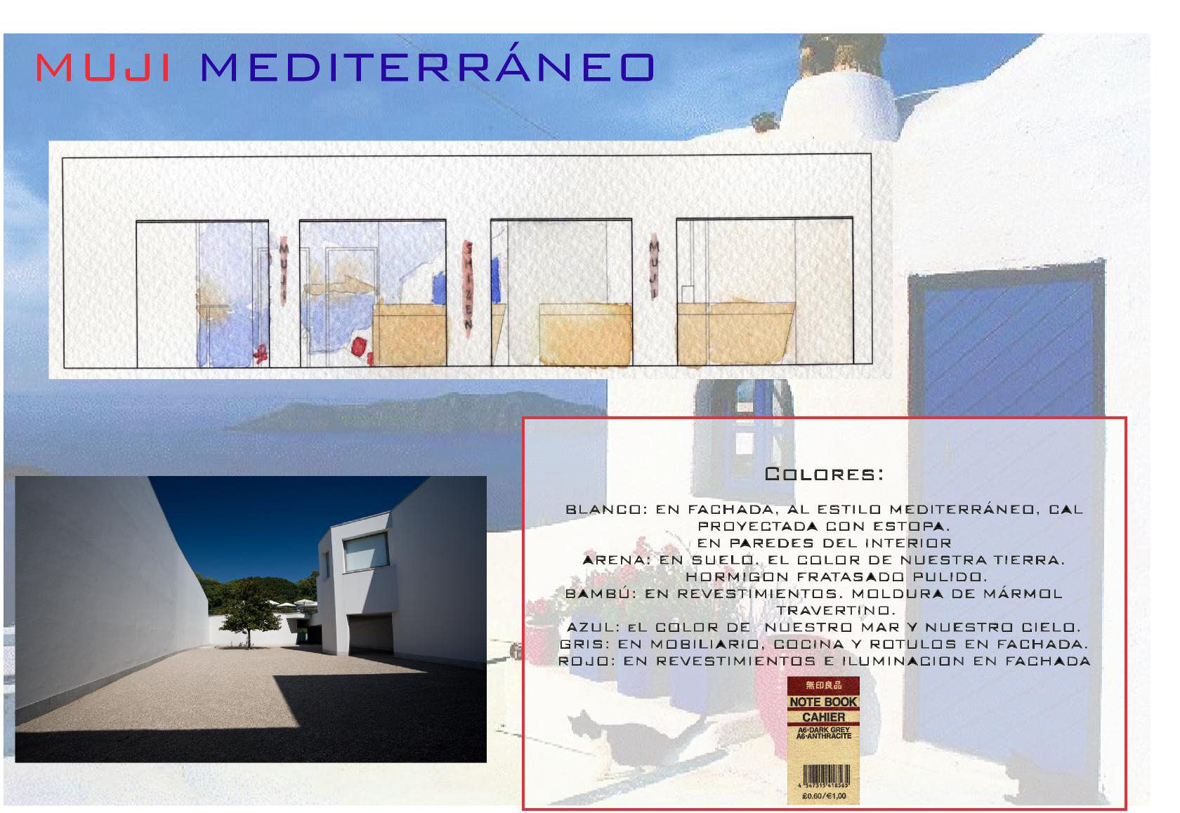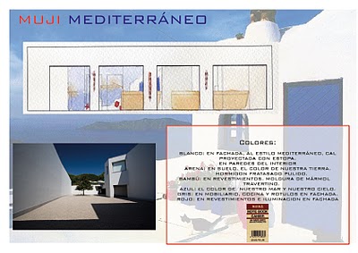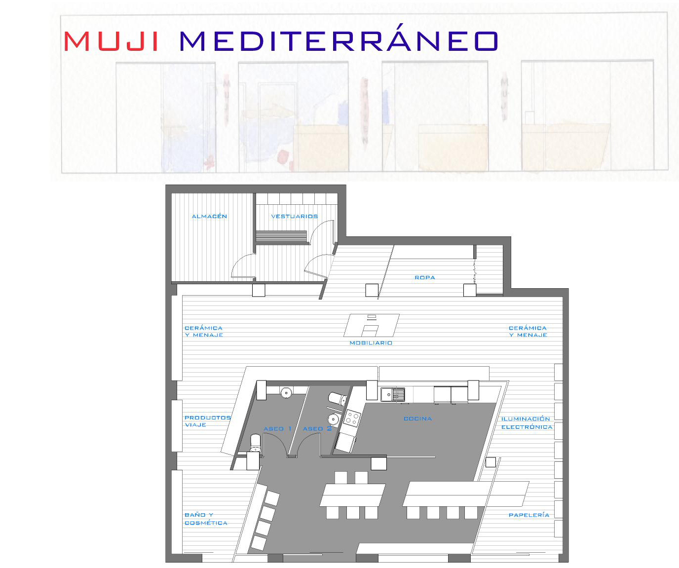 Mi propuesta era realizar un Muji a la mediterránea mediante falso techo de cañizo atado tipo barraca valenciana, y maderas bastas para el mobiliario y expositores. Este local además de la tienda posee una zona destinada a la hotelerÃa proyectado en el centro teniendo muy en cuenta la distribución del producto y los flujos de movimiento que querÃa crear en el local.